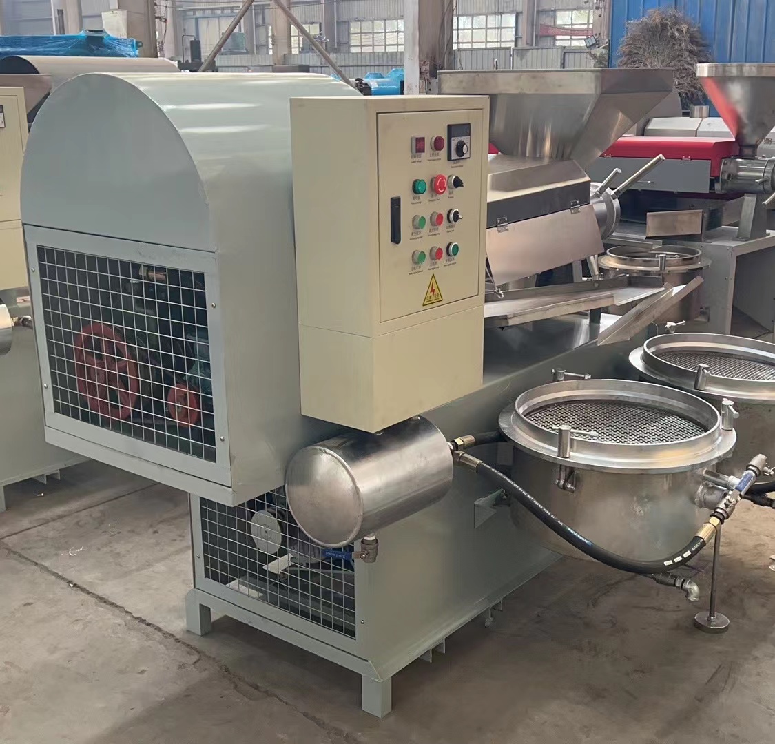 7.新榨油機(jī)安裝后進(jìn)行4—8小時(shí)磨榨,方法是用已榨干油的餅料從料斗中緩緩喂入,反復(fù)回榨,使榨膛磨光,切記開始磨榨不要將料直接倒入料斗內(nèi),而以手抓喂入為宜,以防榨螺軸卡死。如喂料過猛,榨膛內(nèi)出現(xiàn)異常響聲或榨螺軸卡死,應(yīng)立即停車,消除梗阻,或重新裝配好后再啟動(dòng)磨榨,嚴(yán)禁強(qiáng)行拖車。8.正常榨油時(shí),必須保持進(jìn)料均勻,切勿過多過少或斷料空轉(zhuǎn)。此時(shí)機(jī)器負(fù)荷正常,運(yùn)轉(zhuǎn)平穩(wěn),響聲有節(jié)奏。出餅順暢,低壓段基本無渣,高壓段有少量油渣,但渣在油中的比例不大于10%,榨膛內(nèi)溫度可達(dá)150—200℃,出餅口出冒出青煙應(yīng)通過護(hù)罩由抽煙管排出。榨出熱餅要及時(shí)攤開,不要急于打堆或裝運(yùn),否則會(huì)產(chǎn)生自然現(xiàn)象。當(dāng)連續(xù)工作時(shí)間較長(zhǎng),機(jī)溫過高時(shí),應(yīng)采取電扇吹風(fēng)等降溫措施。